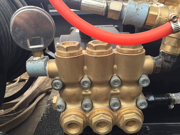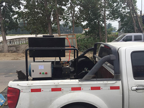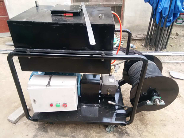 其工作原理為:以汽油機或電動機為動力驅動高壓泵運轉,利用高壓水射流在噴頭上產(chǎn)生的推力疏通管道,當噴頭到達管道時,膠管在卷管器拉力(或人力)作用下強制后移,此時高壓水射流來清理管壁并將雜物帶到管外,以達到清洗管道的目的。